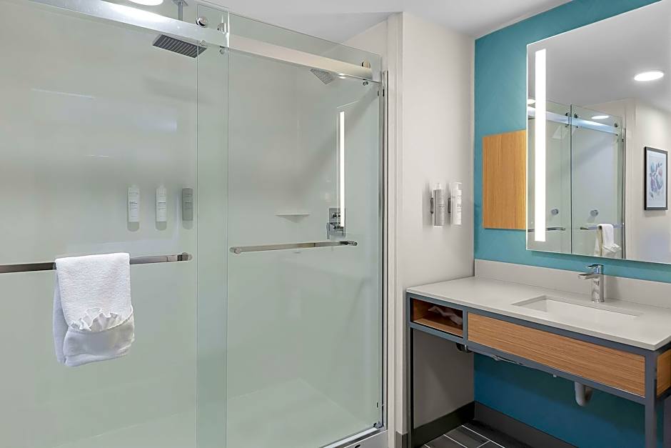 This room includes a microwave, refrigerator and flat-screen TV. It is equipped with an accessible bath tub.